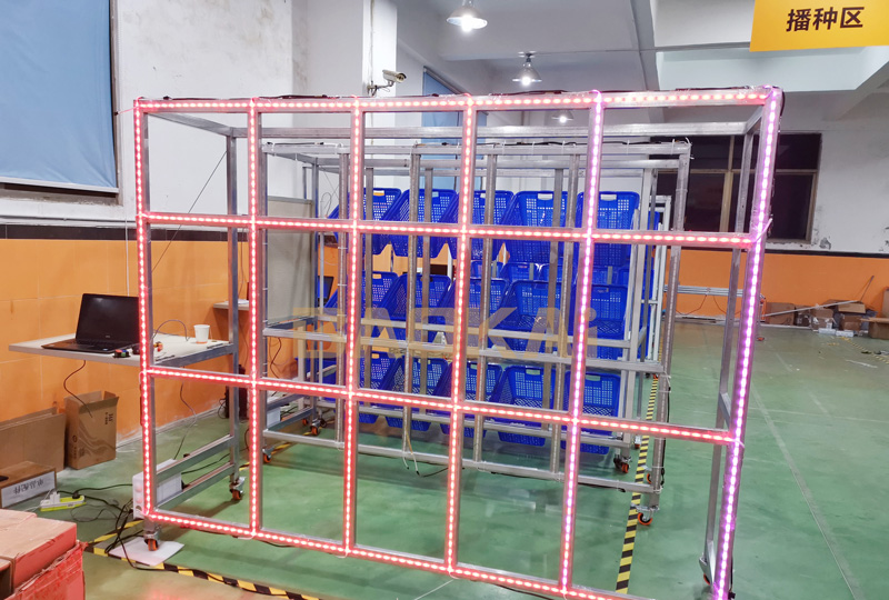 鞋服行业灯带式播种墙作业场景应用,识别速度更快速、精准,RF枪扫描即刻灯带指示相应位置,视觉定位,无需人脑二次反应进行播种位置寻找,拣选效能大幅提升。